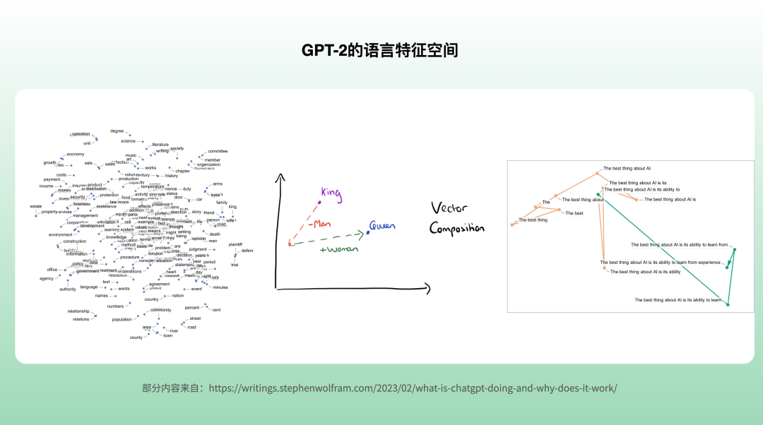 Stephen wolfram试图打开人类语言的特征空间,来观察其中的规律。他选择规模较小的GPT-2的特征空间,把它映射到人类比较容易理解的二维空间,从中发现了许多有意思的现象。比如,crocodile鳄鱼 和 alligator短吻鳄 离得很近,苹果跟梨聚在一起,这个可能容易理解。有趣的是,词汇之间的关系,还能从向量加减操作中反映出来,比如皇帝(King)的向量减去男人(man)的向量,再加上女人(woman)的向量,就变成了女皇(Queen)的向量。