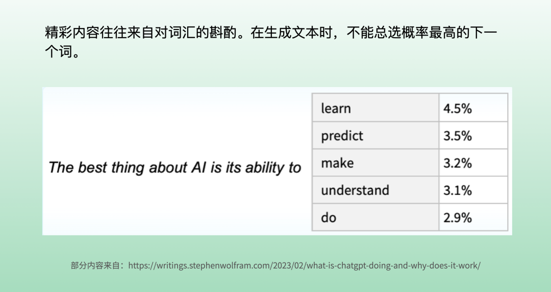 ChatGPT在生成文本时,是每次选择一个词,这个词是在语言模型给出的概率表中做出的选择。当前科研人员的发现是,如果每次都选择概率最高的词汇,理论上是最优解,最后呈现却往往是一篇非常普通的文章;如果不是每次选择最优解,例如随机选择排名稍微靠后一点的,却有更大机会生成一篇精彩文章。这也是个有意思的未解之谜。