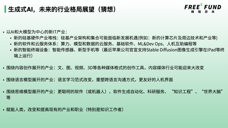 类似于自动化生产制造设备赋能传统工业,各类AI模型和应用软件也将有机会更好地赋能各行各业。但是不同于制造行业,大批量使用的软件,其边际使用成本是非常低的,而且它很聪明、善学习、会思考、会交流,应该会有大量的应用场景有待开发。这里边有非常多的创业机会,也会给各行各业带来新的发展动力。