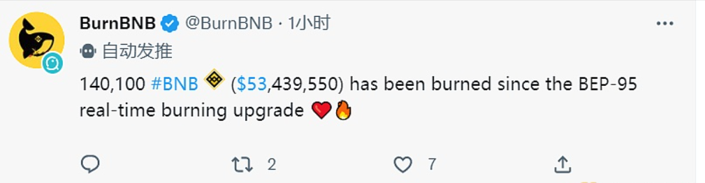 BurnBNB发推特表示,BNB当前实时销毁量为14.01万枚,约合5343.95万美元。 据悉,BNB的实时销毁机制由BEP95提出,类似以太坊当前的EIP-1559销毁机制。