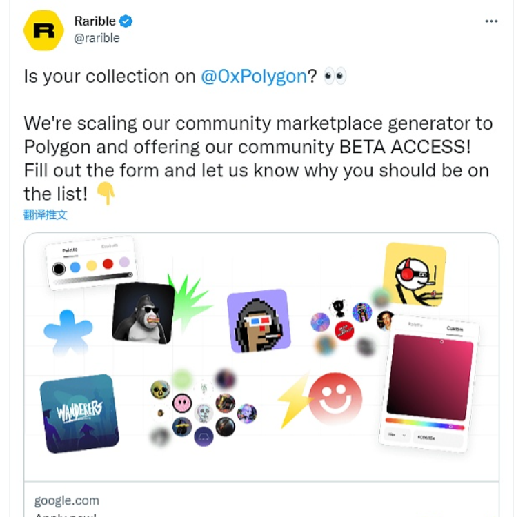 NFT市场Rarible在社交媒体宣布其社区市场生成器已拓展至Polygon,目前已对社区开放了Beta访问权限。Polygon首席执行官Ryan Wyatt表示,Rarible支持Polygon可以减少用户参与摩擦,钱包和平台整合是关键。