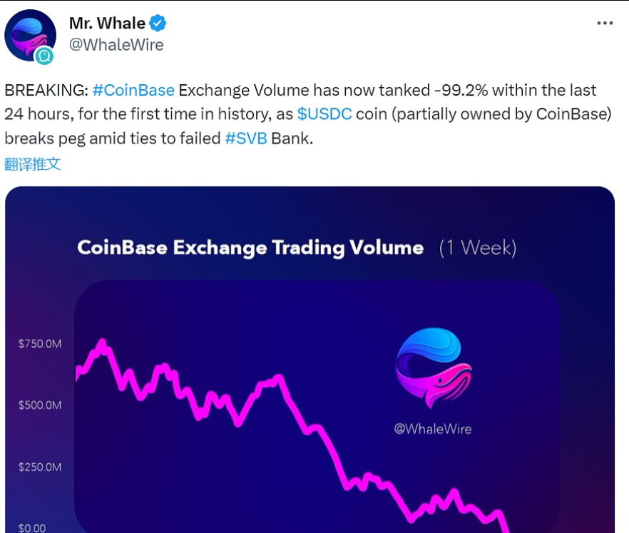 3月12日消息,加密KOL及链上分析师Mr.Whale发布的数据显示,过去24小时加密货币交易所Coinbase交易额已暴跌99.2%,系历史首次,原因或是美元稳定币USDC(由Coinbase部分拥有)在硅谷银行破产中引发脱锚。 Mr.Whale表示,稳定币是99.99%加密市场背后的主要驱动力,当泡沫破灭很容易引发市场崩盘,盲目相信银行是一种危险的游戏,金融崩溃表明即使是最成熟的机构也可能倒闭,从而给依赖它们的人带来毁灭性的后果,那些把所有鸡蛋都放在一个篮子里的人往往会面临破产结局。