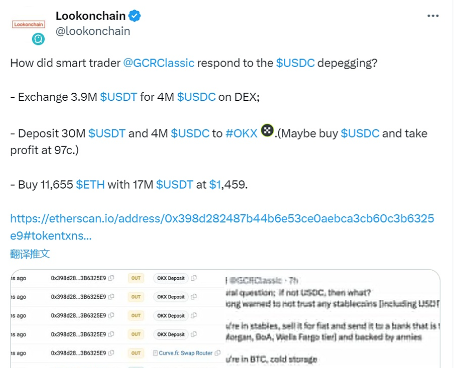 3月12日消息,Lookonchain监测数据显示,在最近USDC脱钩期间,“聪明交易员”GCR的操作如下: -在DEX上将390万枚USDT兑换为400万枚USDC; -向OKX存入3000万枚USDT和400万枚USDC。(可能买入USDC,在其价格0.97美元时获利。) -使用1700万枚USDT买入11,655枚ETH,均价大概1459美元。