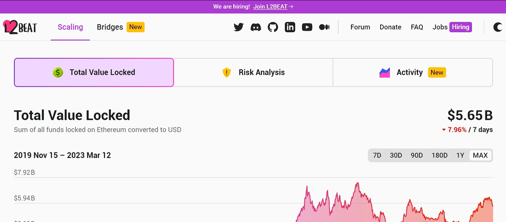 L2BEAT数据显示,截至3月12日,以太坊Layer2上总锁仓量为56.5亿美元。其中锁仓量最高的为扩容方案Arbitrum,约32亿美元,占比56.68%;其次是Optimism,锁仓量为16.3亿美元,占比28.99%;第三为dYdX,锁仓量为2.88亿美元,占比5.1%.