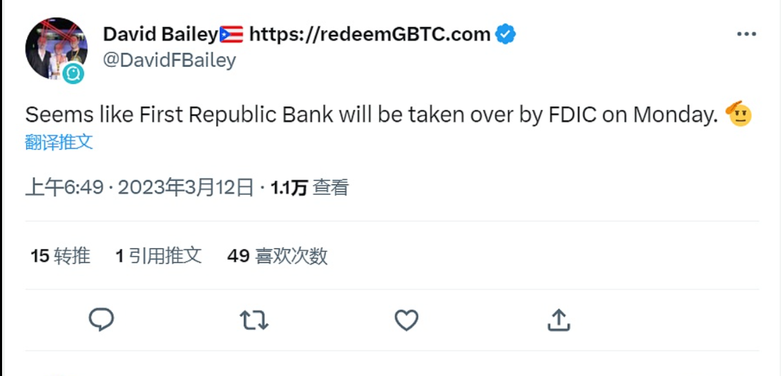据加密KOL、推特标记为X 3创始人的Andrew转发Bitcoin Magazine首席执行官David Bailey的推文,美国联邦存款保险公司(FDIC)或于3月13日(下周一)接管First Republic Bank,若属实这将是近期面临困境的第三家加密友好银行。 此前《富爸爸穷爸爸》作者罗伯特·清崎也表示,硅谷银行的倒闭和Silvergate银行的自愿清算之后会有第三家银行面临倒闭。