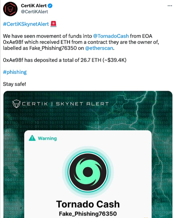 据CertiK监测,被Etherscan标记为“Fake_Phishing76350”的EOA账户地址(0xAe98f)已将资金转至Tornado Cash。该EOA地址总共向Tornado Cash转入26.7 枚ETH(约3.94万美元)。