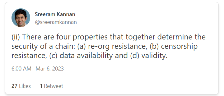 图:决定一条链的安全性有四大特点:(a)抗重组,(b)抗审查,(c)数据可用性以及(d)有效性。