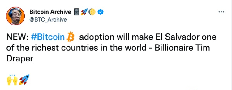 风险资本家、比特币投资者Tim Draper表示,比特币的采用将使萨尔瓦多成为世界上最富有的国家之一。