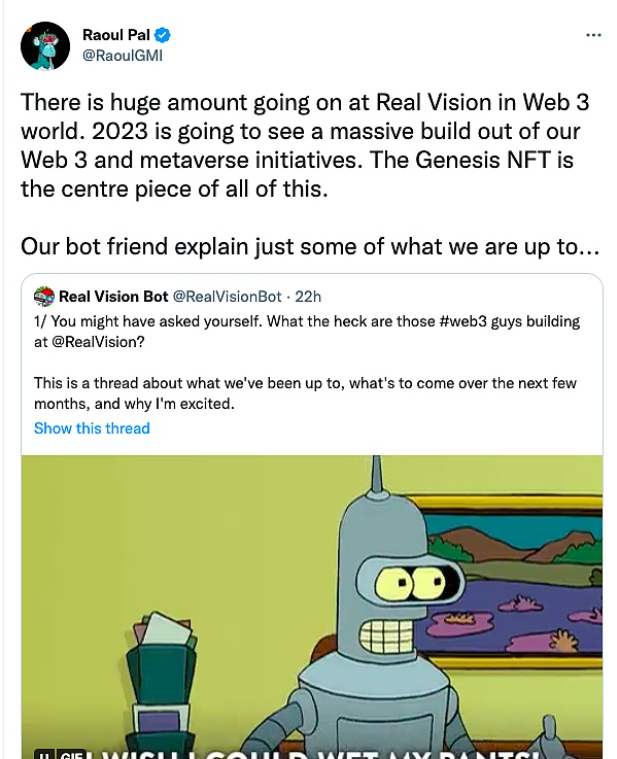 前高盛高管Raoul Pal在社交媒体上称,在Web3世界中,Real Vision正在进行大量工作。2023年将看到我们的Web3和元宇宙计划的大规模构建。Genesis NFT是这一切的核心。我们的机器人朋友只解释了我们正在做的一些事情……