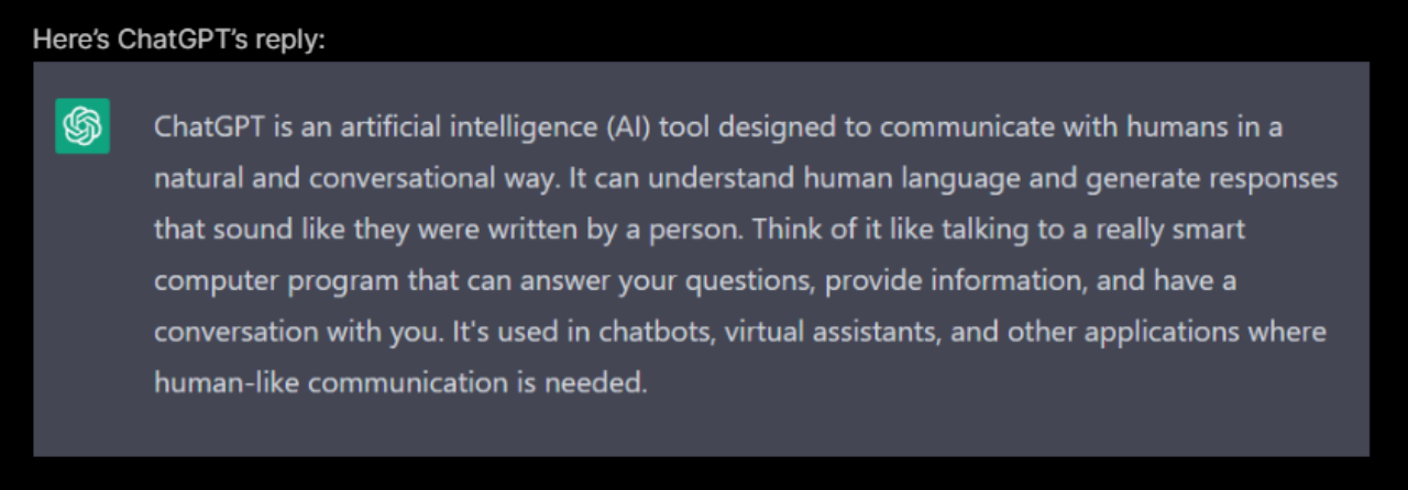 但ChatGPT到底是什么,为什么会在全球范围内引起如此轰动?ChatGPT自己的回答是这样的:ChatGPT是一个人工智能 (AI) 工具,旨在以自然的对话方式与人类进行交流。它可以理解人类语言并生成看起来像是人的回答。把它想象成与一个真正智能的计算机程序进行对话:它可以回答您的所有问题、提供信息并与您交谈。它可用于聊天机器人、虚拟助手和其他需要人类交流的应用程序。
