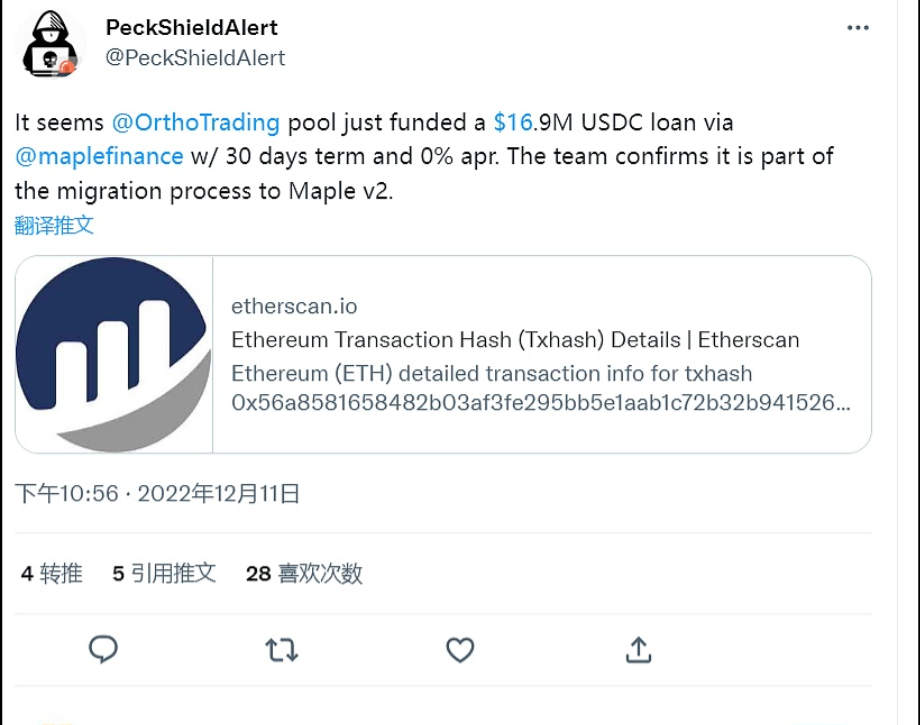 12月12日消息,据派盾PeckShield监测显示,加密交易公司Orthogonal Trading通过机构借贷协议Maple Finance推出1690万美元的USDC贷款,期限为30天,年利率为0%,据团队确认这是向Maple v2迁移过程的一部分。 据悉,Orthogonal Trading拖欠Maple Finance总计3600万美元的贷款。
