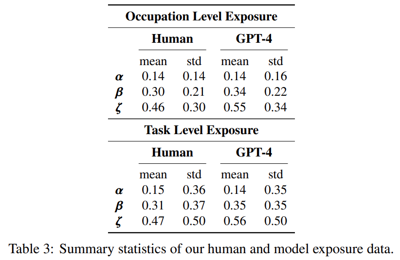 下表 3 是人类和 GPT-4 模型的总体 exposure 数据。其中,人类和 GPT-4 的数据表明平均 occupation-level ? 值介于 0.14 和 0.15 之间,这表明对于中等职业,大约 15% 的任务直接受到 GPT 影响。对于 ?,这个数字增加到 30% 以上,对于 ?,这个数字则超过 50%。