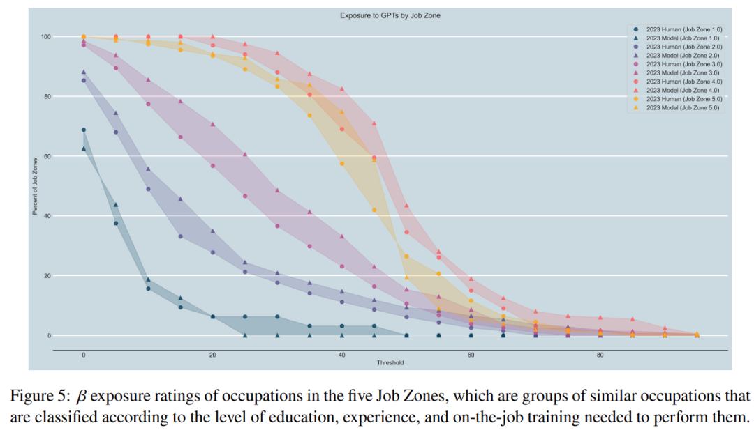 然后,该研究又从不同的职业分类探究了 GPT 模型的影响,包括 ONET 数据库中的 5 个 Job Zone。其中,Job Zone 1 中的工作入职要求最低,Job Zone 5 则最高。