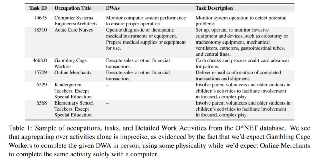 在方法上,该研究根据 exposure rubric 来展示结果,Exposure rubric 定义为访问 GPT 或 GPT 驱动的系统是否会将人类执行特定 DWA 或完成任务所需的时间减少至少 50%。(注:DWA 全称 Detailed Work Activities ,可以将其理解为完成任务所需要的动作,例如表 1,对于计算机系统工程师,其 DWA 包括监控电脑系统性能,确保正常运作。)