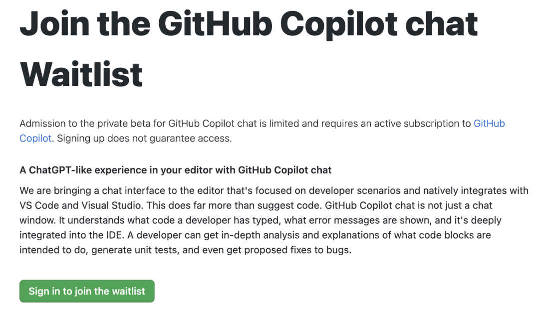 不过,有些遗憾的是,GitHub Copilot chat 当前并没有公开测试,想要早日用上,还需要先付费订阅 GitHub Copilot。