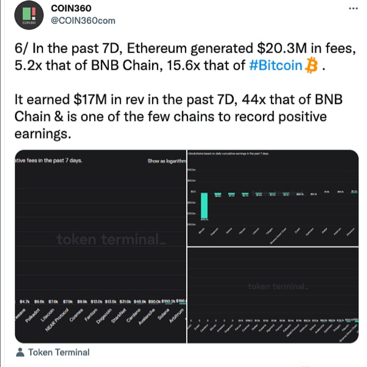 据coin360数据显示,在过去的12小时内,价值1760万美元的多头中有87.76%被平仓。在过去的7天里,以太坊产生了2030万美元的费用,是BNB Chain的5.2倍、BTC的15.6倍。它在过去7天的收入为1700万美元,是BNB Chain的44倍,并且是为数不多的录得正收益的公链。