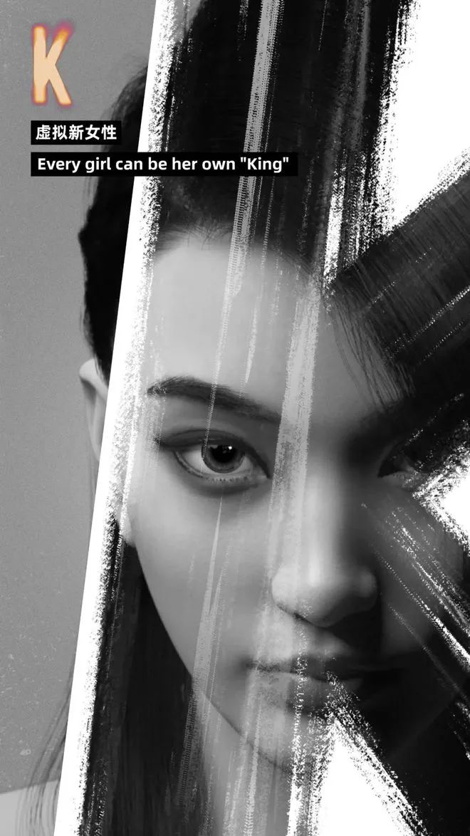 “K”是一名来自元宇宙的虚拟音乐人,“她”的诞生是为了致敬那些推动人类进步的先锋女性。同时,“K”主张“Every girl can be her own King”(King 指代一种绝对权力象征而非性别身份,因此把 King 缩减为 K 来去除性别指代),每个女性都可以掌控自我、主导人生。
