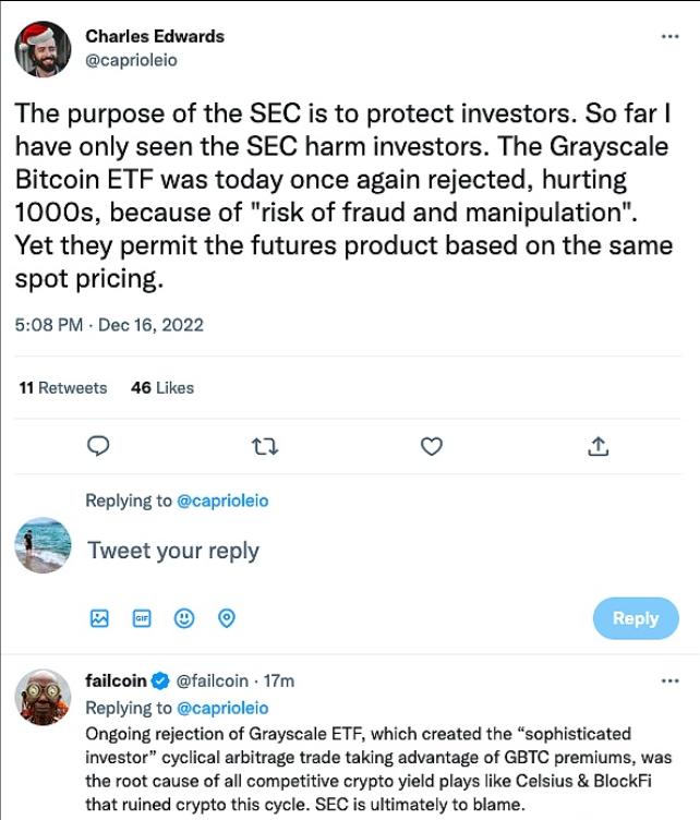 Capriole Investment创始人Charles Edwards在社交媒体上称,美国证券交易委员会(SEC)的目的是为了保护投资者。到目前为止,我只看到SEC伤害了投资者。灰度比特币ETF今天再次被拒绝,伤害了很多人,理由是有 “欺诈和操纵的风险”。但他们却允许基于相同现货定价的期货产品。 对灰度ETF的持续拒绝,创造了利用GBTC溢价的 “复杂投资者 “周期性套利交易,这是 Celsius 和 BlockFi 等所有竞争性加密货币收益游戏的根本原因,它们破坏了这个周期的加密货币。SEC最终是罪魁祸首。