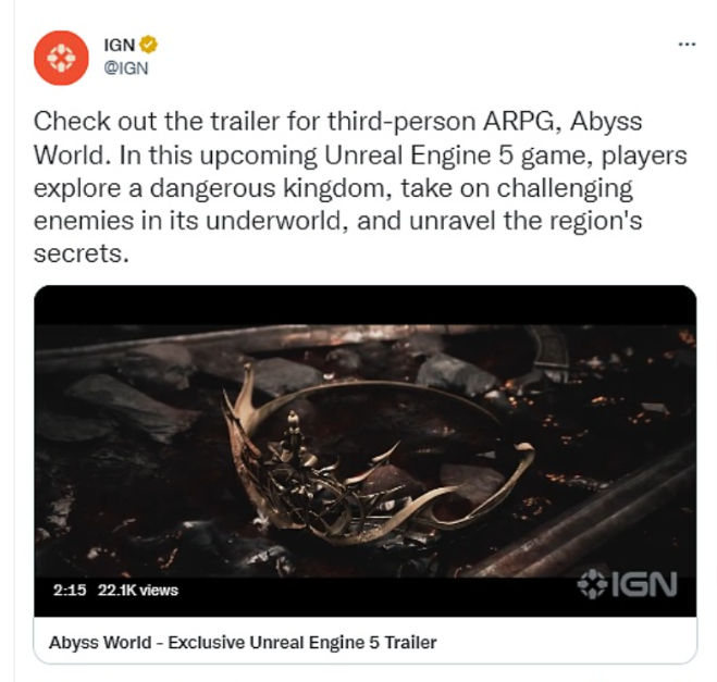 12月16日消息,IGN官方推特刚发布了一款第三人称ARPG游戏Abyss World的预热视频,这也是IGN发布的首个Web3游戏视频。 据悉,IGN是一家多媒体和评论网站,主要对象为视频游戏,现已发展成为全球规模最大的游戏娱乐媒体。