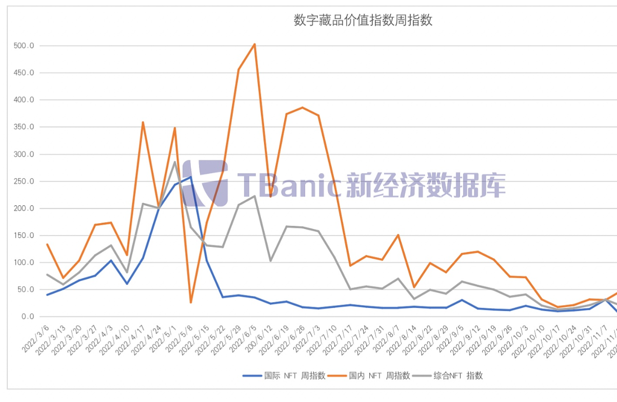 据同伴客数据显示,上周(2022年12月12日-12月18日)数字藏品国际周指数上涨7.1点至26.0点,国内周指数上升32.0点至88.6点,数字藏品综合价值周指数上涨17.1点至51.0点。 注:数字藏品综合价值指数由同伴客数据与链境Labs联合研发,是对国际及国内当月市场热度最高的数字艺术品项目市场总销售规模的综合反映,以2021年11月份销售额的30分之7为基数,指数基值为100。国内周指数成分之一的幻核于8月16日发布平台终止运营公告,但销量已于7月10日后归零。为遵循去掉某一成分后指数计算结果无变化的原则,该指数使用幻核7/4-7/10的销售数据进行销售基数调整,并将新的销售基数作为8/14后的指数计算基数。