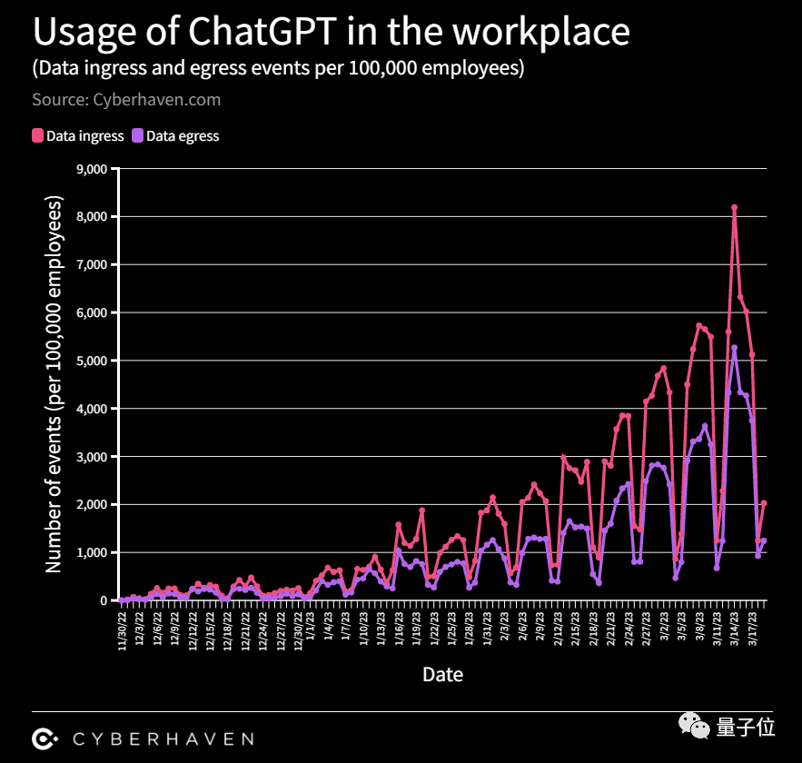他们发现,随着ChatGPT的应用率越来越高,给它上传企业数据的打工人数量也越来越多。