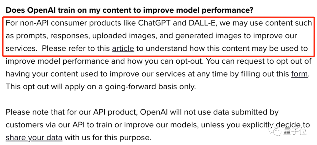 不过,在OpenAI上周更新的数据使用说明中确实有提到,对于非API产品如ChatGPT、DALL-E,平台确实会使用用户数据来进一步提升模型效果。