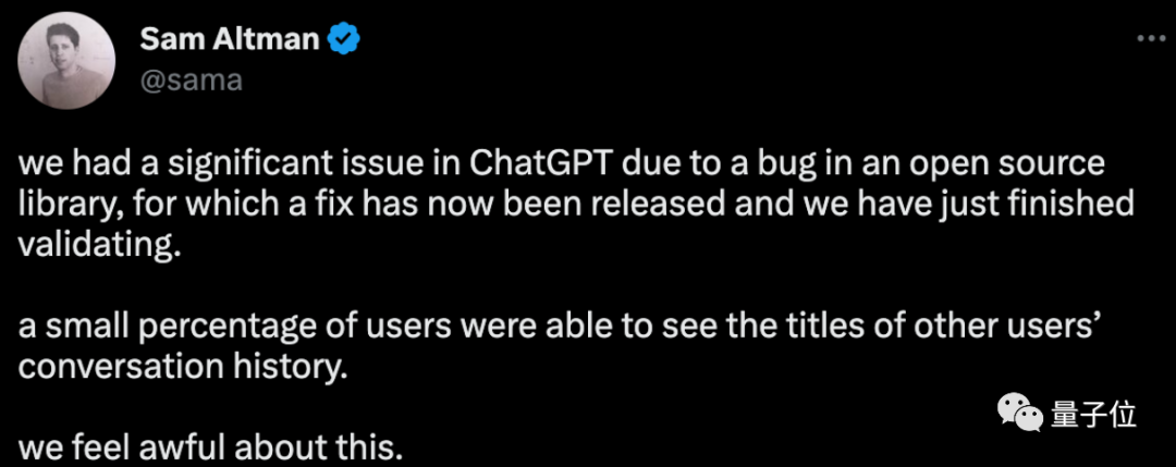 OpenAI CEO山姆·奥特曼随即回应,这个bug来自开源库,他们使用这个库在其服务器中缓存用户信息。