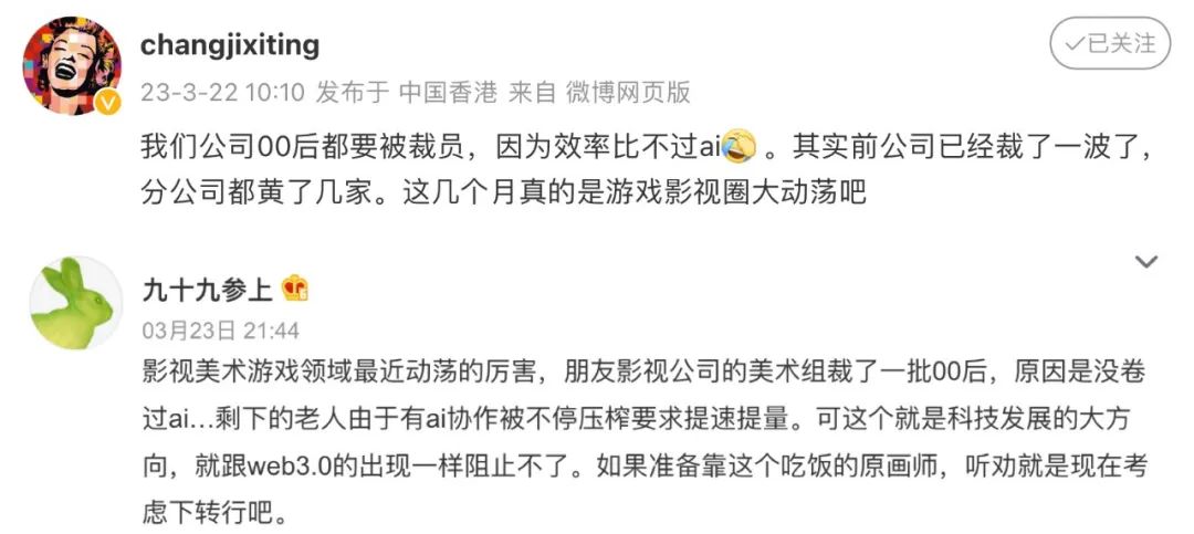除了国内外公司都在积极拥抱AI,AI引发的裁员潮也已然发生。特别在影视美术领域,有从业者在微博爆料其公司裁掉了“没卷过AI”的大批00后新人,留下的老手因有AI协作被公司要求提速提量,从业者正面临前所未有的职业危机。