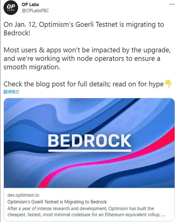 12月22日消息,OP Labs宣布,Optimism Goerli测试网将在2023年1月12日迁移到Bedrock。 大多数用户和应用程序不会受到此次升级的影响。目前Optimism已与Alchemy、Ankr、Chainlink、Etherscan、Infura、Quicknode和Tenderly等合作伙伴合作,以确保顺利升级,1月12日将共享一个迁移的数据库,以便这些合作伙伴和其他节点运营商可以启动其升级的节点。 据此前报道,今年5月,Optimism宣布推出去中心化Rollup基础架构Bedrock,该架构尽可能重用以太坊的代码、基础设施和设计模式,并表示“EVM等效”已是过去时,Bedrock带来的是“以太坊等效”。Optimism表示,Bedrock将作为交互式故障证明系统Cannon的基础架构进行发布,其优势包括交易费用降低、最大吞吐量提升、节点同步速度提高。