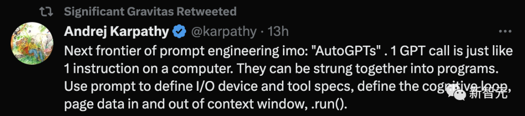 Andrej Karpathy表示,在我看来,提示工程的下一个前沿领域是「AutoGPT」。一个GPT调用就像计算机上的一个指令。它们可以被串联成程序中。使用提示来定义I/O设备和工具规格,定义认知循环,在上下文中分页数据输入和输出,然后运行。