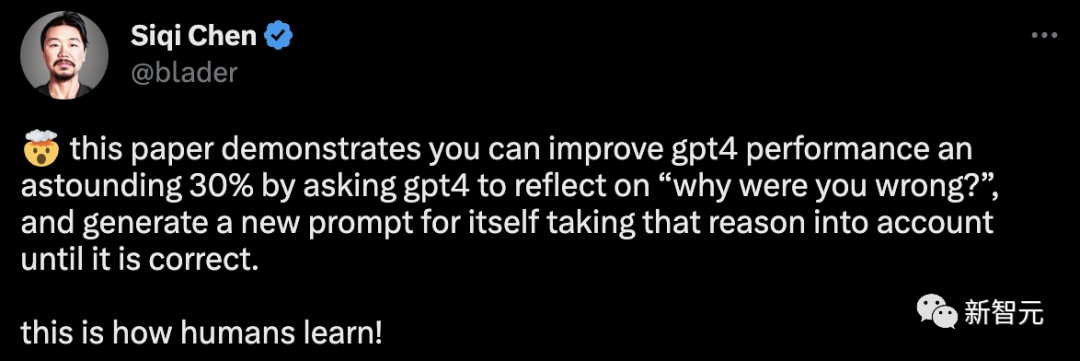 有网友便表示,你可以通过要求 GPT-4 反思「你为什么错了?」,并为自己生成一个新的提示,将这个错误原因考虑在内,直到结果正确,从而将GPT-4的性能提高惊人的30%。