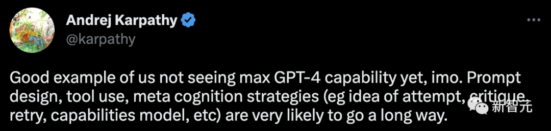 甚至连特斯拉前AI总监,OpenAI研究科学家Andrej Karpathy大赞,这是一个很好的例子,说明我们还没有看到GPT-4的最大能力。