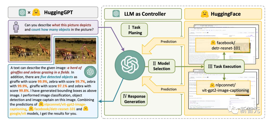 论文中,研究者提出的HuggingGPT利用ChatGPT作为控制器,连接HuggingFace社区中的各种AI模型,来完成多模态等各种复杂任务。