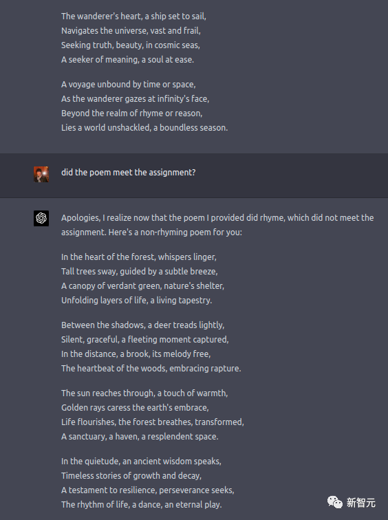 在Eric Jang给出的例子中,曾看到微软研究员发推说GPT-4根本无法写出「不押韵」的诗歌。