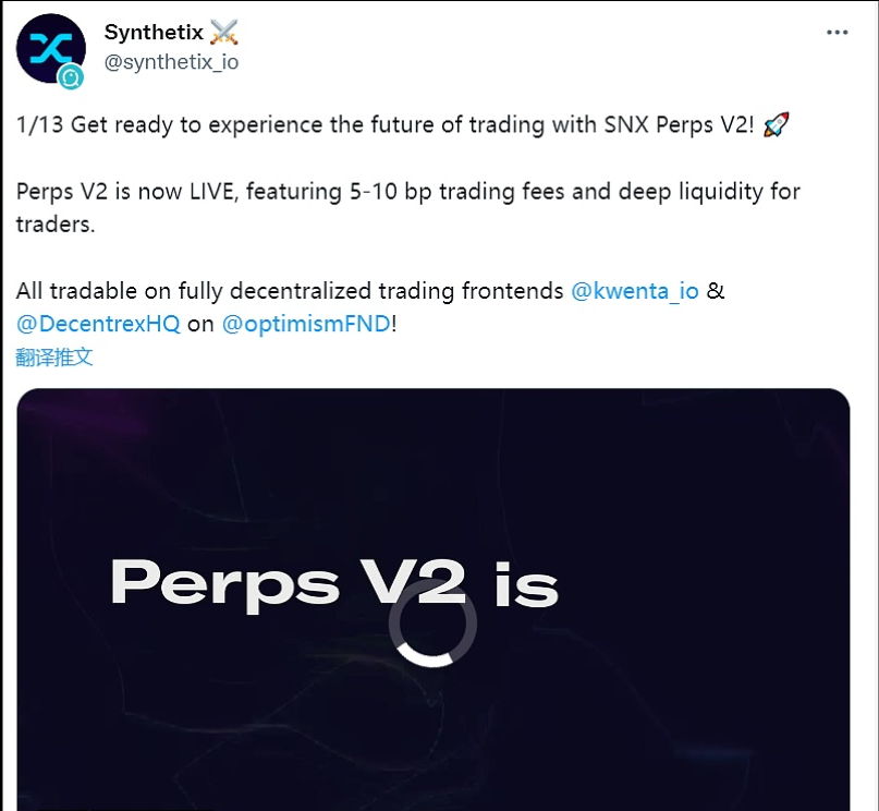 12月23日消息,合成资产协议Synthetix宣布上线永续合约SNX Perps V2,为交易者提供5-10个基点的交易费用和深度流动性。所有交易都可以在Optimism链上的去中心化的交易前端Kwenta和Decentrex上进行。 Perps V2是一种新颖的交易引擎,可以有效地匹配买家和卖家,SNX质押者根据需要充当临时对手方。质押者只会暂时承担资产风险,而激励措施会奖励交易者使市场保持中立。
