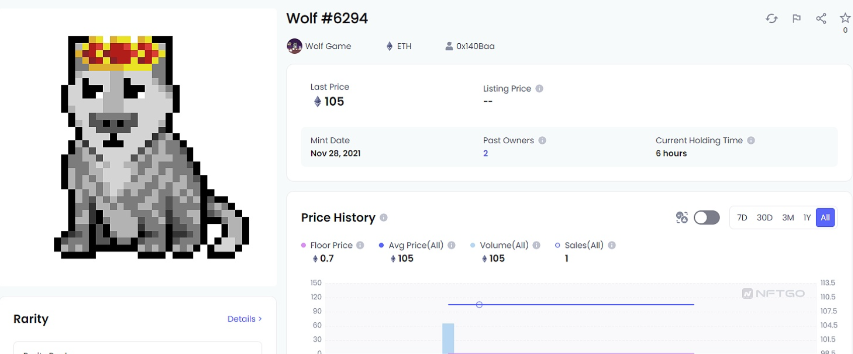 12月24日消息,NFTGo数据显示,GameFi&NFT项目Wolf Game系列中的Wolf Game #6294已经以105 ETH价格成交,约合12.812万美元,创下该系列迄今为止最高交易记录。 截至目前,Wolf Game地板价触及0.7 ETH,市值为5006万美元,交易总额达到8069万美元。