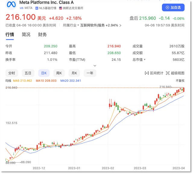 Meta的股价已经反映了AI对元宇宙的故事加成,在经历了长达一年多的下跌后,它从去年11月初开始振作,股价从88.09美元一路涨至如今的216.1美元,半年时间大涨145.32%。
