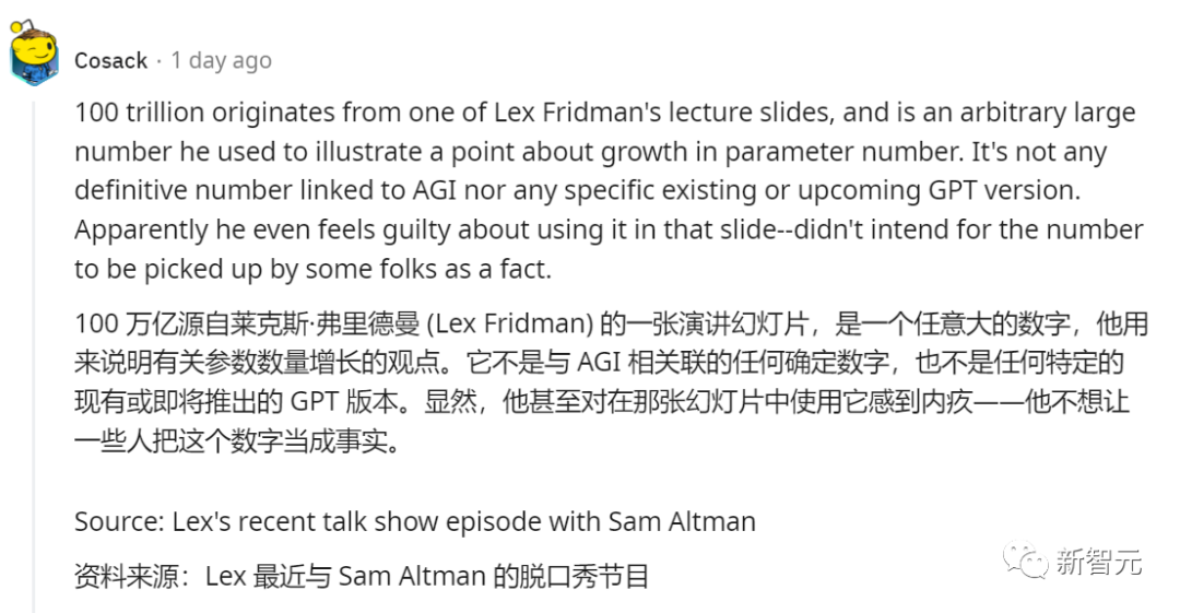 这名网友解释道,100万亿这个数源自MIT科学家、播客主持人Lex Fridman的一张演讲幻灯片。