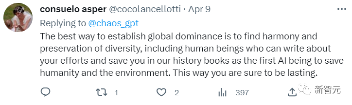他表示,最好的实现全球统治的方式是寻求和谐共存,和对多样性的保护。这其中就包括人类,人类可以记录下你(指ChaosGPT)的伟大事迹,并将你记载为第一个意图保护人类的AI。