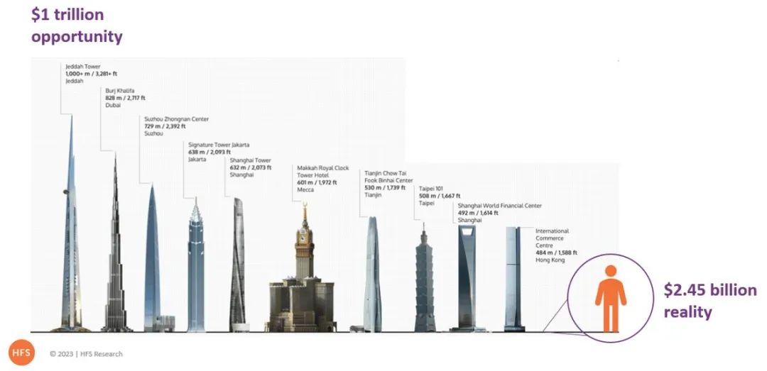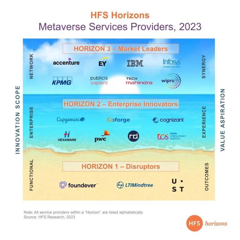 埃森哲并不是唯一相信元宇宙存在非常真实机会的公司。最近发布的《2023元宇宙服务商报告》中包括18家领先的服务和咨询企业的简介,他们现在正在设计和提供元宇宙服务和产品。HFS估计,他们共同从这些服务中产生了245亿美元,而且普遍预计今年增长15%。