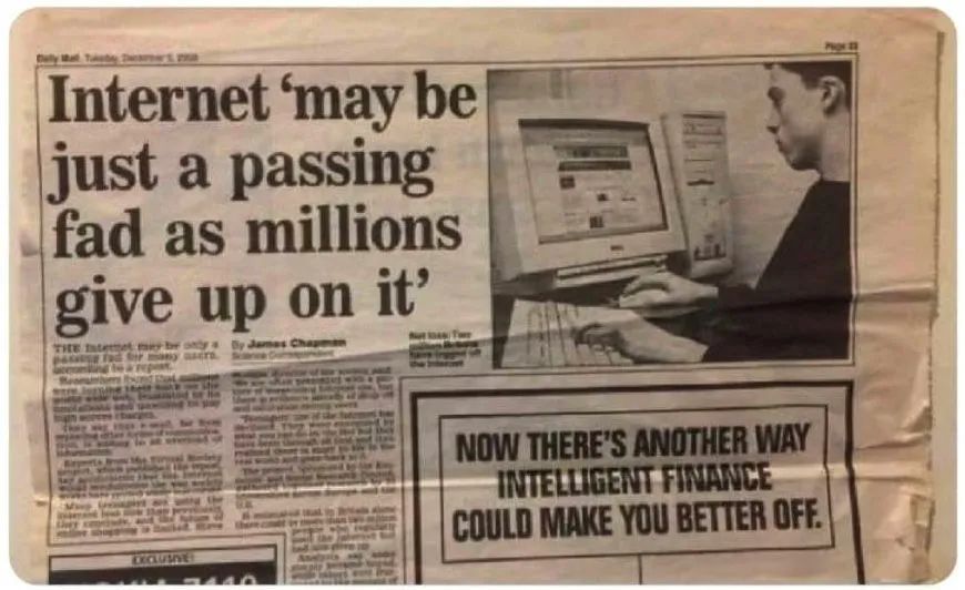 最近的一些报道,比如《华尔街日报》的文章——《“元宇宙”正在迅速转变为“多余-宇宙”》,以及《金融时报》的一些类似报道。这让我们想起了2000年英国的知识宝库《每日邮报》上一篇经典文章的标题:“互联网可能只是一种过时的时尚,它可能只是昙花一现”。这些黑白分明的早期判断是头条猎人的典型行为。