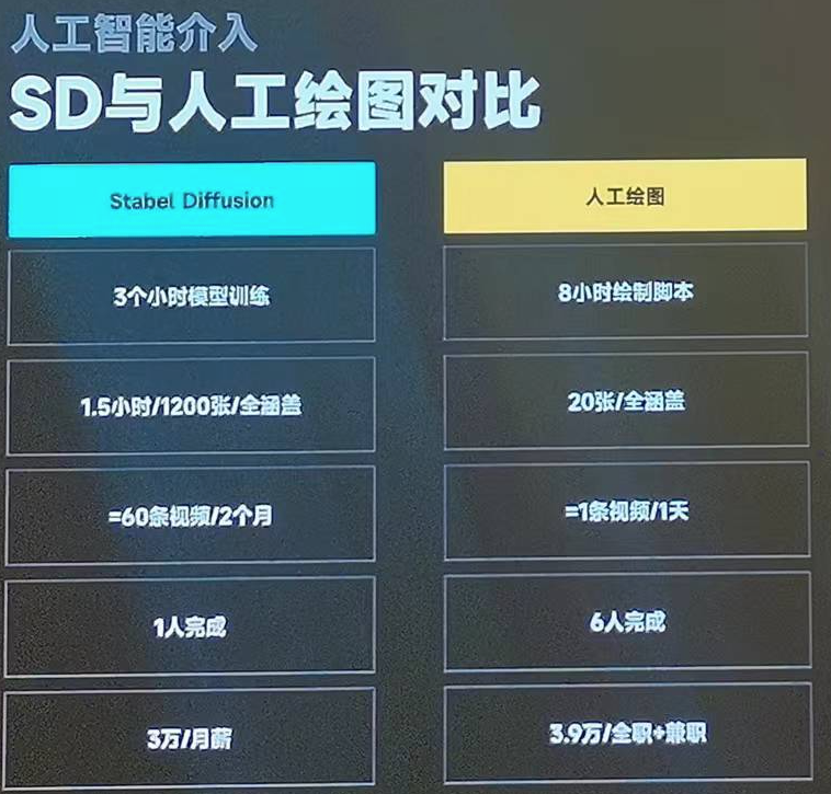 而如果结合Lora训练模型、Stabel Diffusion等AI工具,1个AI画师可完成的工作量,甚至超过6个人。例如AI画师可以在1.5小时完成1200张绘图工作,基本能够满足一个账号两个月的用量,而且质量也有保证。