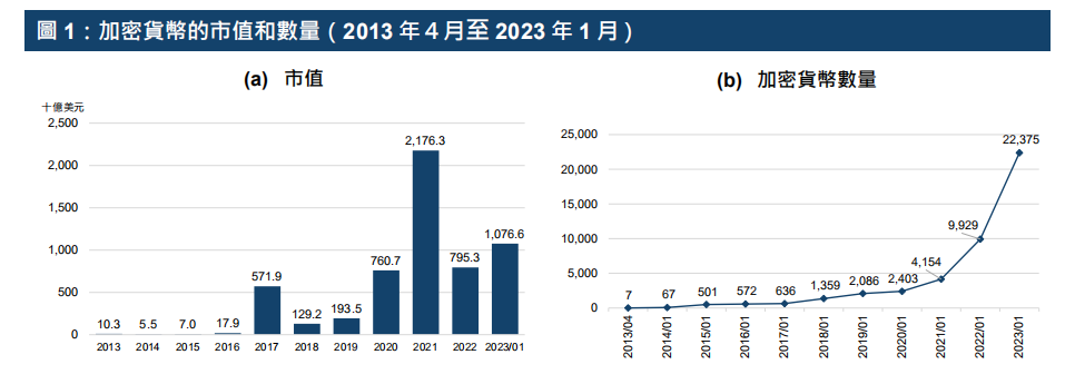- 加密货币的数量则从 2013 年 4 月的 7 种大幅增加到 2023 年 1 月底的 22,375 种;