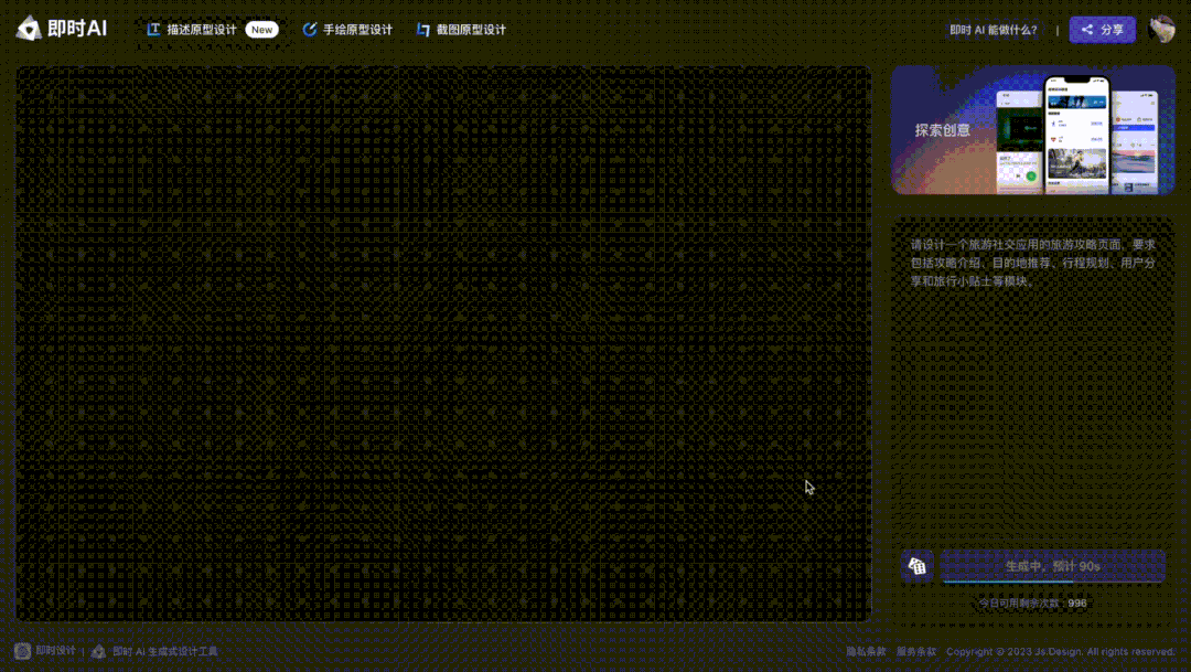 「即时 AI」基于在线协作设计平台「即时设计」,利用大语言模型,让人们在网页端就可以通过自然语言描述,实现可编辑 UI 设计稿的快速生成。