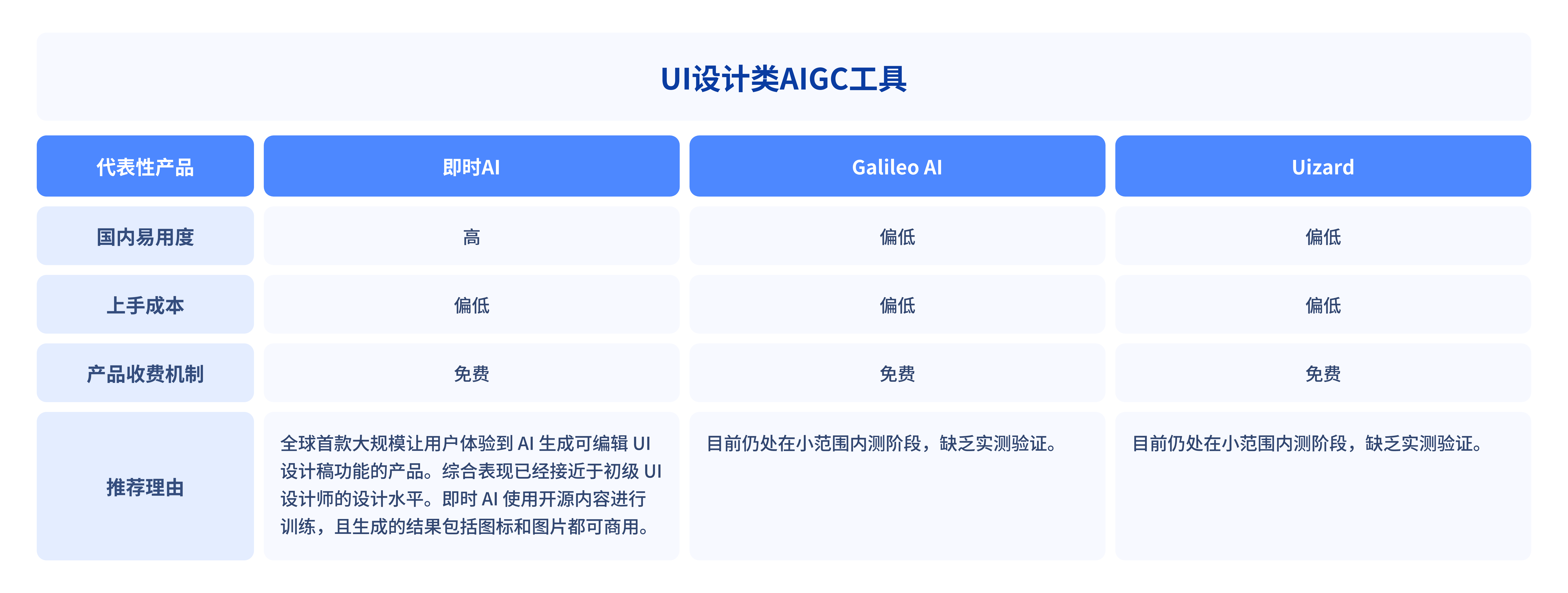 根据国内权威的用户体验平台 「UI 中国」发布的盘点报告,目前全球有三款产品可以实现「AI 生成可编辑 UI」的功能,分别是「即时 AI」、Galileo AI 以及 Uizard。其中国外的两款产品仍停留在小范围内测阶段。目前,「即时 AI」是全球首款可以大规模让用户体验到「AI 生成可编辑 UI 设计稿」功能的产品。