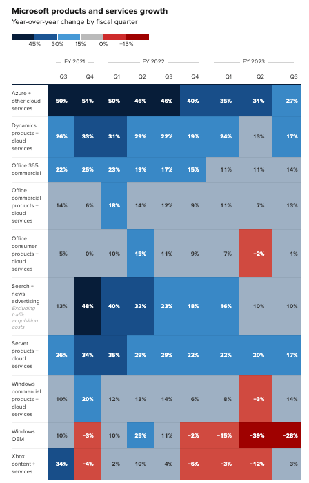 鉴于最近几个季度下滑的 PC 销售情况,此前很多分析认为疲软的经济大环境将大幅打击微软的 Windows 业务,但此次财报显示,Windows相关销售额下降并没有预期那么严重。虽然个人计算机业务营收同比下降9%、Windows系统营收同比下降28%,但都比上个季度的情况有所好转。此外,Windows商业产品及相关云服务和Xbox内容及服务营收都实现逆转,分别增长14%和3%。