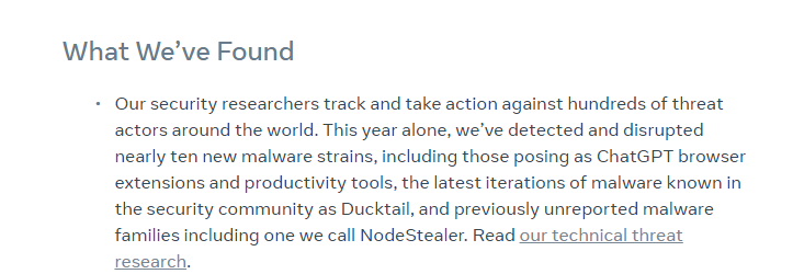 Meta表示,它已经“调查并采取行动,打击这些利用人们对OpenAI的ChatGPT的兴趣,诱骗他们安装假装提供AI功能的恶意软件。”