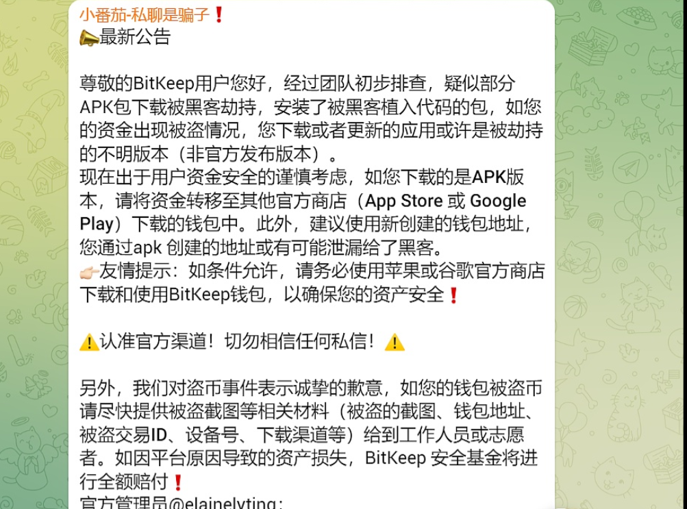 12月26日消息,Web3多链钱包BitKeep发布公告称,经过团队初步排查,疑似部分APK包下载被黑客劫持,安装了被黑客植入代码的包。如用户资金出现被盗情况,用户下载或者更新的应用或许是被劫持的不明版本(非官方发布版本)。现在出于用户资金安全的谨慎考虑,如用户下载的是APK版本,请将资金转移至其他官方商店(App Store或Google Play)下载的钱包中。此外,建议使用新创建的钱包地址,用户通过APK创建的地址或有可能泄漏给了黑客。BitKeep发布提示称:“如条件允许,请务必使用苹果或谷歌官方商店下载和使用BitKeep钱包,以确保您的资产安全。” 金色财经此前报道,多名用户在其官方Telegarm群中称其资金被盗,BitKeep团队称如因平台原因导致的资产损失,BitKeep安全基金将进行全额赔付。