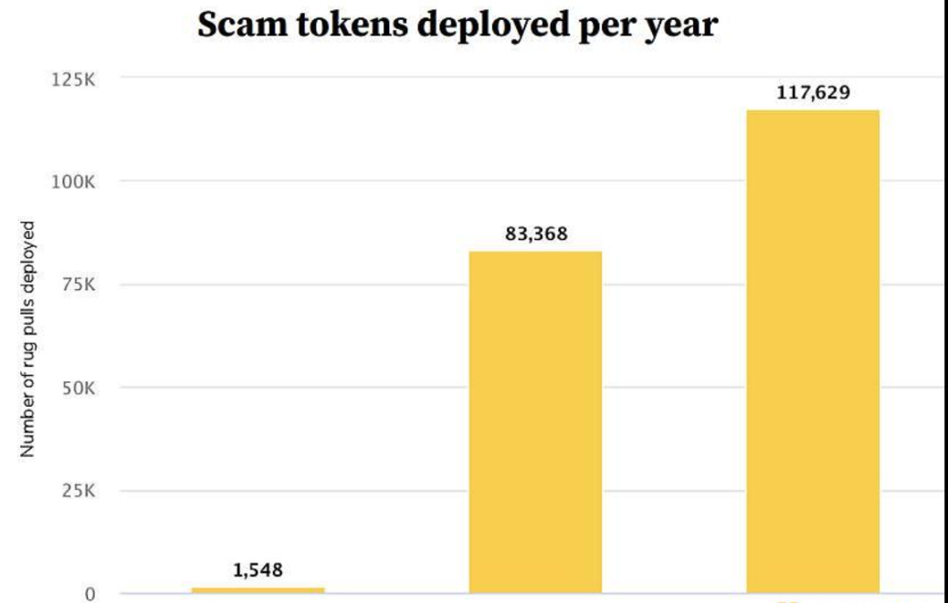 12月26日消息,区块链风险监测公司Solidus Labs的一份新报告显示,从2022年1月1日到12月1日,欺诈者在链上部署了超过117,000个诈骗代币,比2021年全年增长了41%。其中8%来自以太坊,12%来自BNBChain。 据悉,CoinMarketCap追踪的加密货币数量已超过22,000种,但许多现有代币不符合该网站的上市指南。Solidus Labs首席运营官Chen Arad指出,并非所有部署在区块链上的代币都在数据网站上列出,因为它们未经验证。