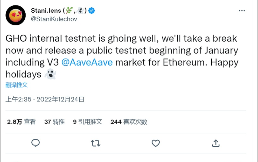 12月26日消息,Aave创始人Stani Kulechov在推特上表示,Aave的原生稳定币GHO的内部测试网进展顺利。Aave将于2023年1月初发布一个GHO的公共测试网。此外,Aave还将于1月在以太坊部署Aave V3。 金色财经此前报道,Aave发行超额抵押稳定币GHO的提案已获得投票通过。